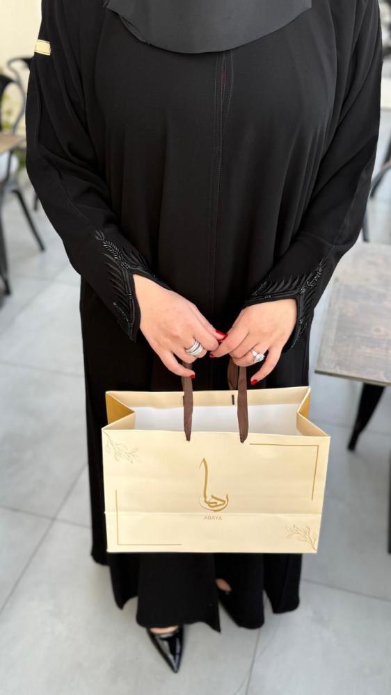 طول العباية يؤخذ من الكتف الى أسفل الكعبين (من الأمام)